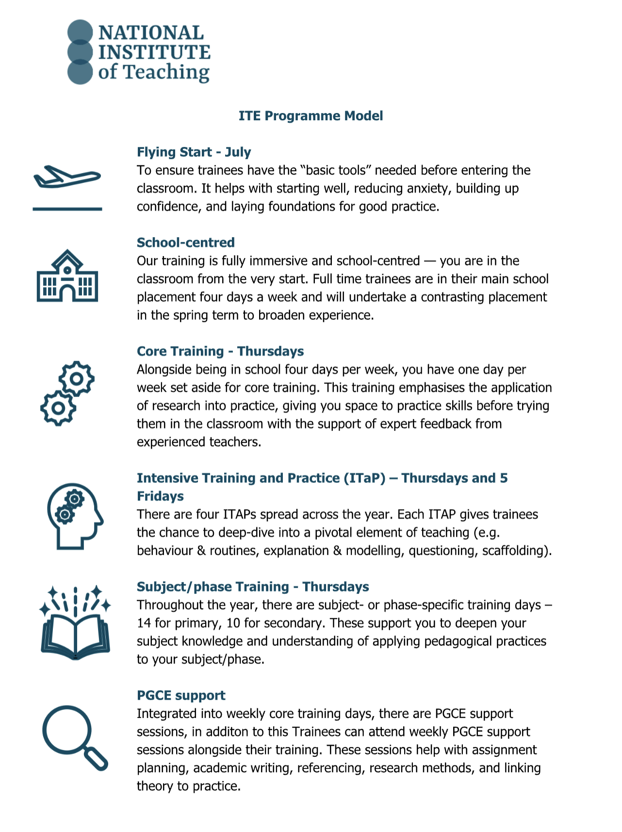 You will be assessed holistically against the NIoT Curriculum, in both your school-based and core training. By the end of the course, you will demonstrate you have met the Teachers’ Standards as required for QTS. The PGCE element of the programme is assessed by master’s level assignments and school experience